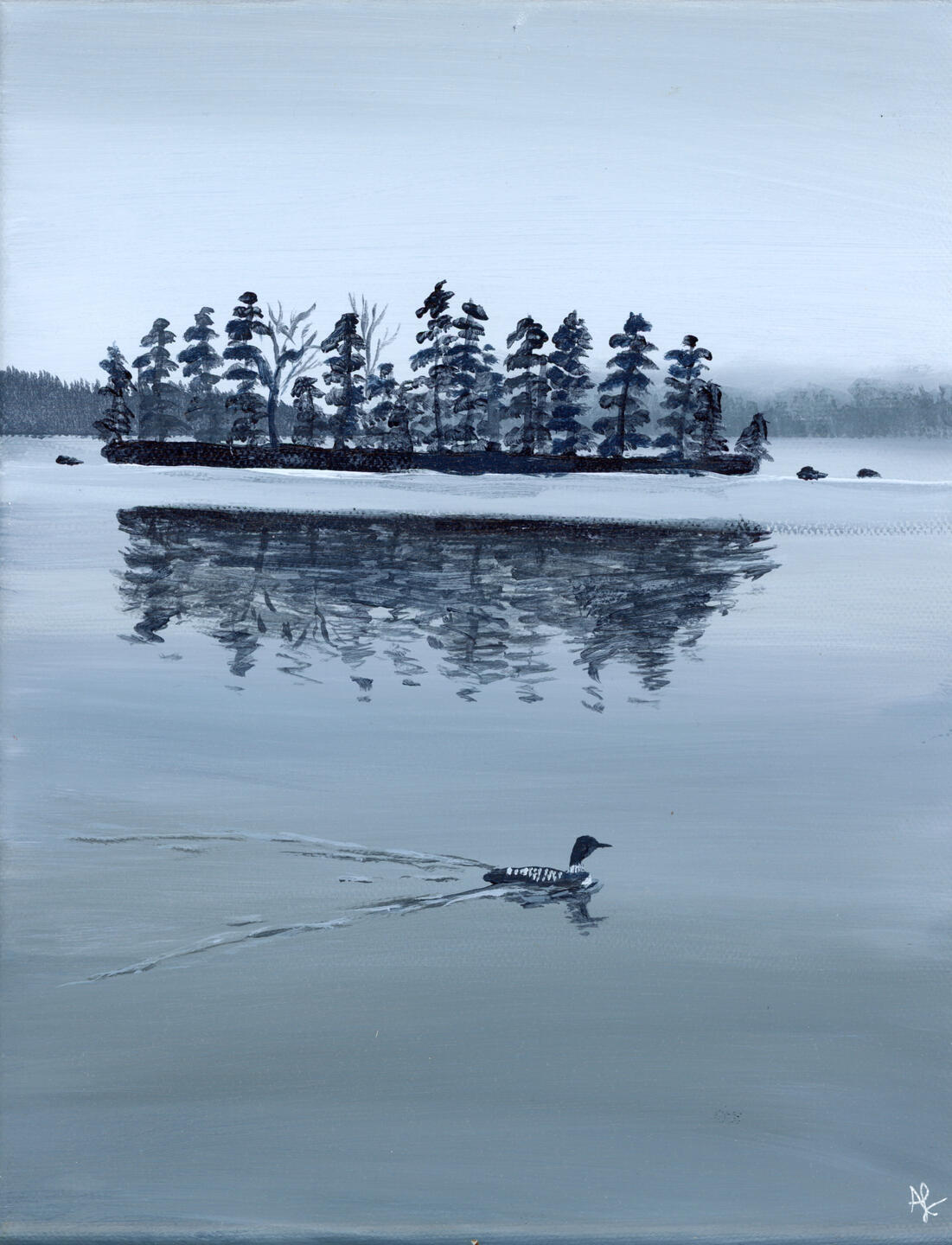 A Loon in the Mist, 2023, 8x10 acrylic on canvas